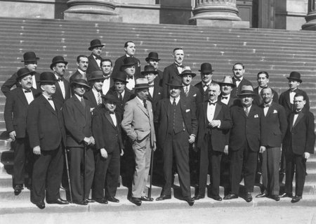 A second example: The photograph was taken in Budapest in the 1930s.[2] We see a group of well-dressed men. All of them are wearing suits, ties or bow ties, and white shirts. Some of them are wearing hats. The men have positioned themselves on the steps of the National Museum, presumably under the careful direction of the photographer, so that all their heads are clearly visible. According to the caption, the men are members of the Association of Hungarian Romani Musicians. They had been organized as a union in Hungary for many years to represent their interests. Within the social stratification of Hungarian Roma groups, Roma musicians, especially the most famous among them, occupied the highest positions. Unlike their rural counterparts, they were often perceived by mainstream society as urban protagonists of a quasi-national musical genre.