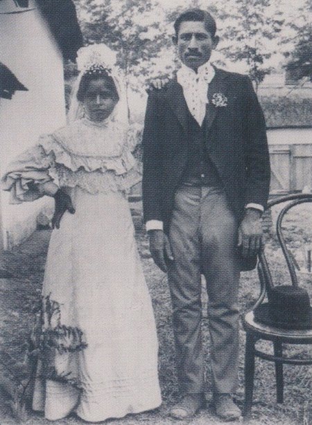 Sándor Ùjházy: Roma couple in wedding attire, photographed in 1911 in Karcag, Jász-Nagykun-Szolnok County, Hungary.